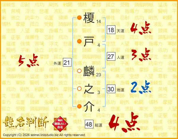 榎(14画)戸(4画) 麟(23画)之(3画)介(4画)