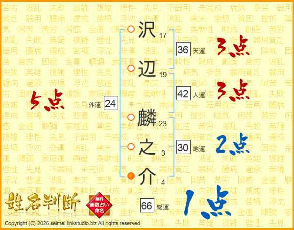 沢(17画)辺(19画) 麟(23画)之(3画)介(4画)