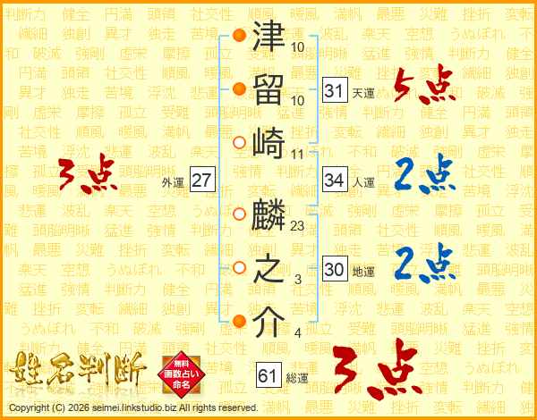 津(10画)留(10画)崎(11画) 麟(23画)之(3画)介(4画)