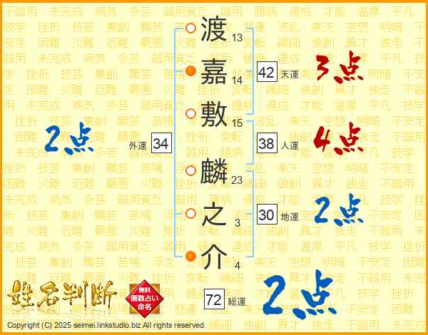 渡(13画)嘉(14画)敷(15画) 麟(23画)之(3画)介(4画)