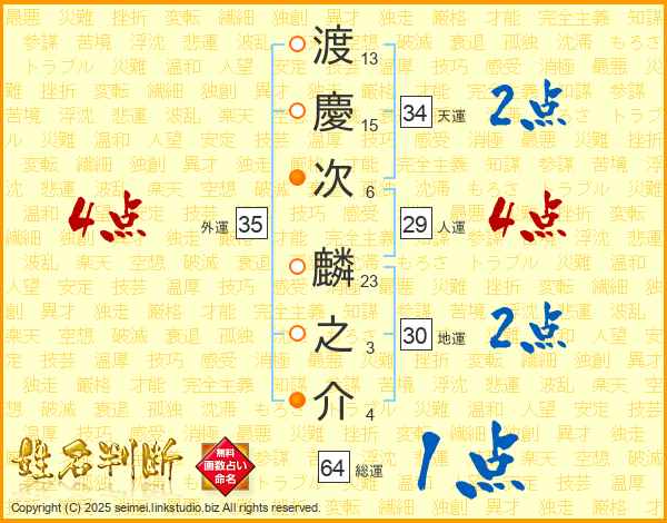 渡(13画)慶(15画)次(6画) 麟(23画)之(3画)介(4画)