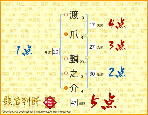 渡爪麟之介さんの総運は47画の5点!