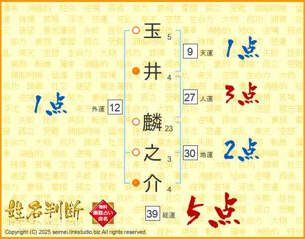 玉(5画)井(4画) 麟(23画)之(3画)介(4画)