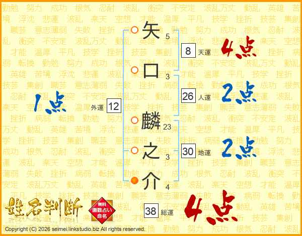 矢口麟之介さんの総運は38画の4点!