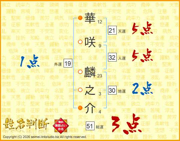 華(12画)咲(9画) 麟(23画)之(3画)介(4画)