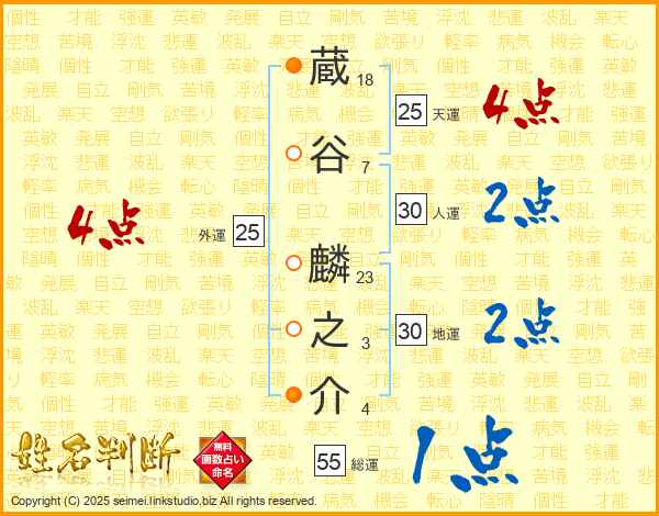 蔵(18画)谷(7画) 麟(23画)之(3画)介(4画)