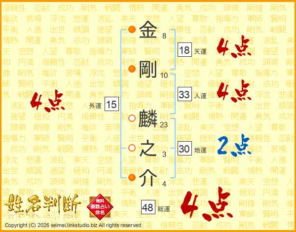 金(8画)剛(10画) 麟(23画)之(3画)介(4画)