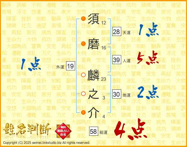 須(12画)磨(16画) 麟(23画)之(3画)介(4画)