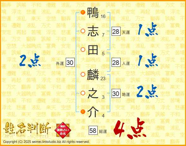 鴨(16画)志(7画)田(5画) 麟(23画)之(3画)介(4画)