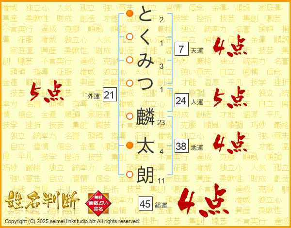 と(2画)く(1画)み(3画)つ(1画) 麟(23画)太(4画)朗(11画)