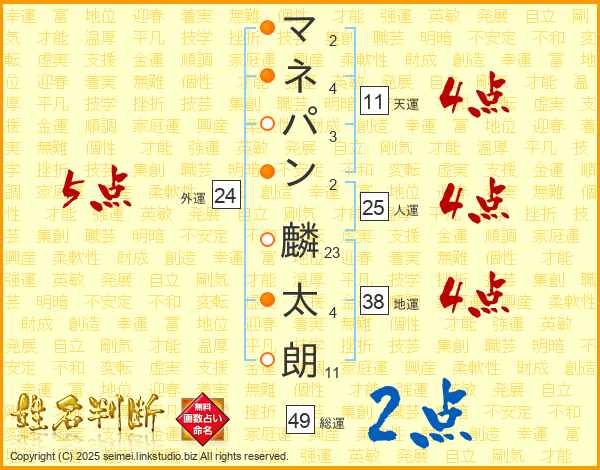 マ(2画)ネ(4画)パ(3画)ン(2画) 麟(23画)太(4画)朗(11画)