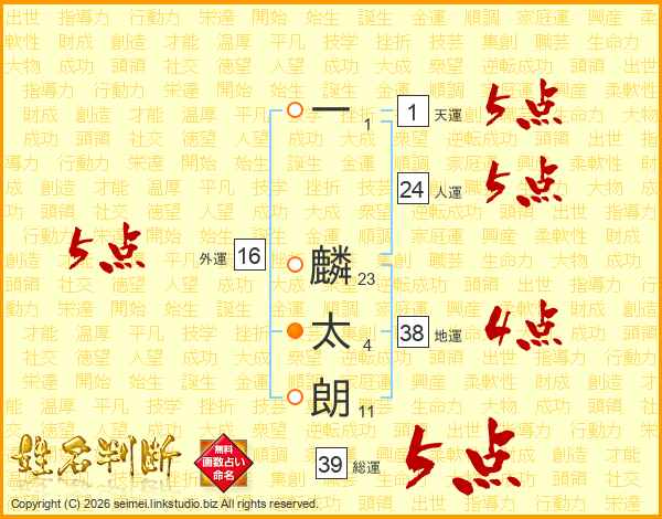 あなたの人生を表す1番重要な運勢です。生涯を通じて影響する総合運となり、主に50歳以降の晩年期に影響を及ぼします。苗字と名前の合計画数。