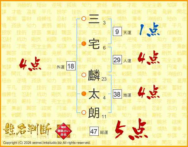 三(3画)宅(6画) 麟(23画)太(4画)朗(11画)