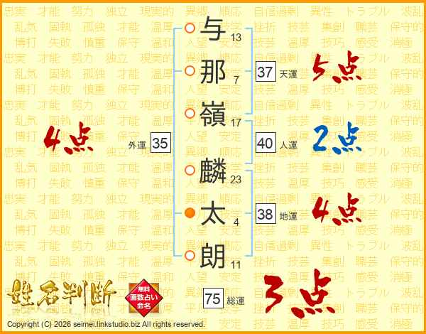 与(13画)那(7画)嶺(17画) 麟(23画)太(4画)朗(11画)