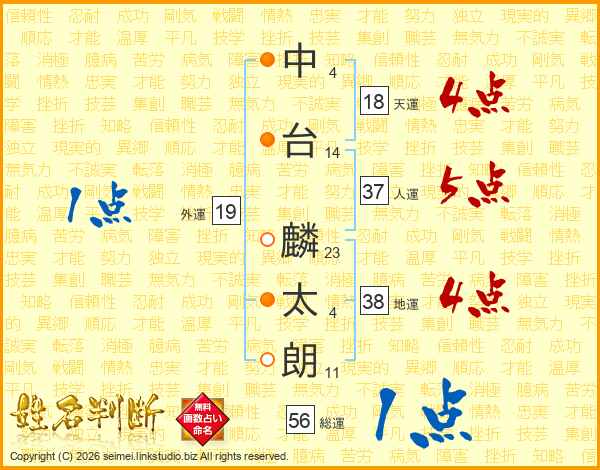 中(4画)台(14画) 麟(23画)太(4画)朗(11画)