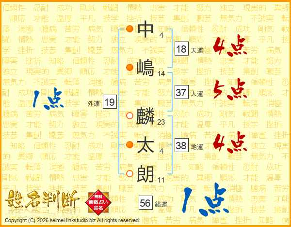 中(4画)嶋(14画) 麟(23画)太(4画)朗(11画)