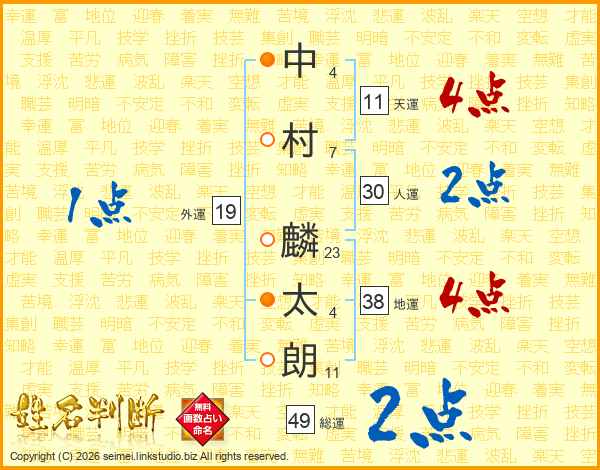 中(4画)村(7画) 麟(23画)太(4画)朗(11画)