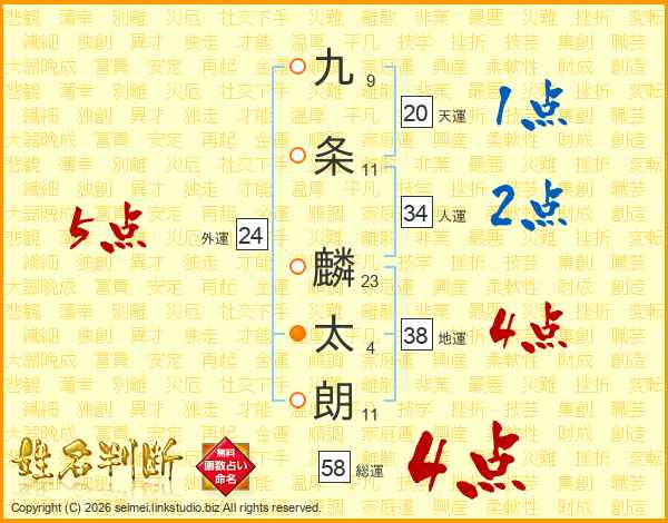 九(9画)条(11画) 麟(23画)太(4画)朗(11画)