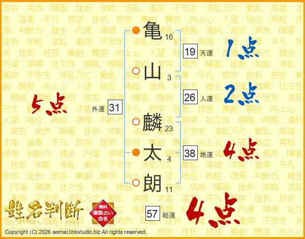 亀(16画)山(3画) 麟(23画)太(4画)朗(11画)