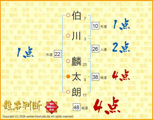 伯(7画)川(3画) 麟(23画)太(4画)朗(11画)