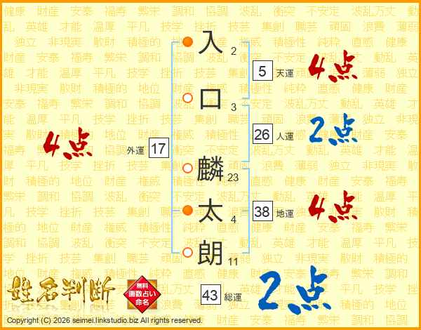 入(2画)口(3画) 麟(23画)太(4画)朗(11画)
