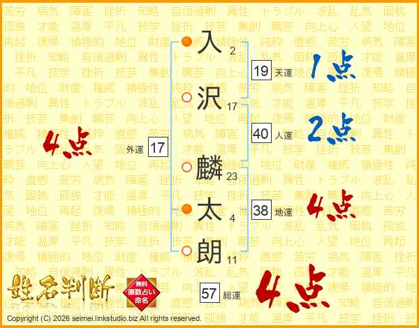 入(2画)沢(17画) 麟(23画)太(4画)朗(11画)