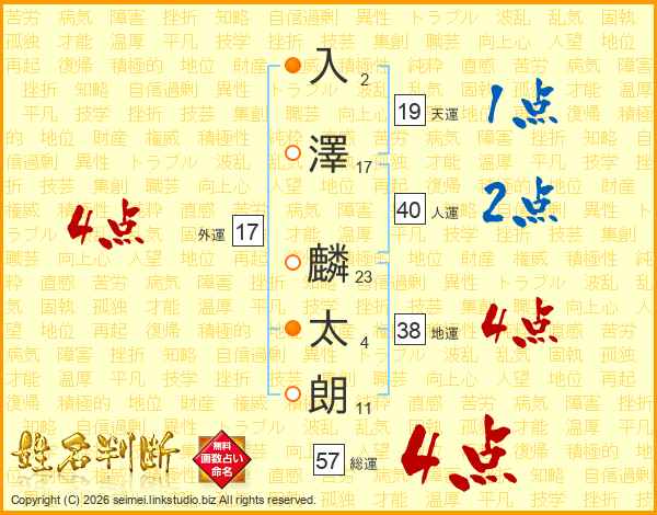 入(2画)澤(17画) 麟(23画)太(4画)朗(11画)