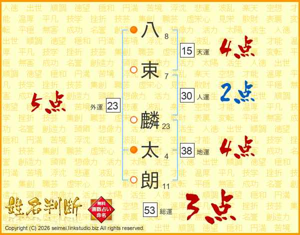 八(8画)束(7画) 麟(23画)太(4画)朗(11画)