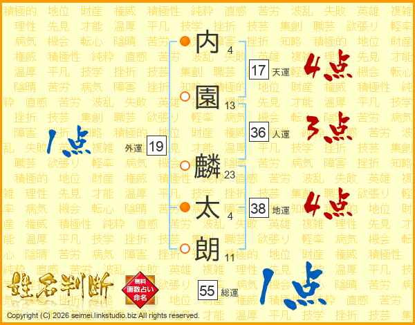 内(4画)園(13画) 麟(23画)太(4画)朗(11画)