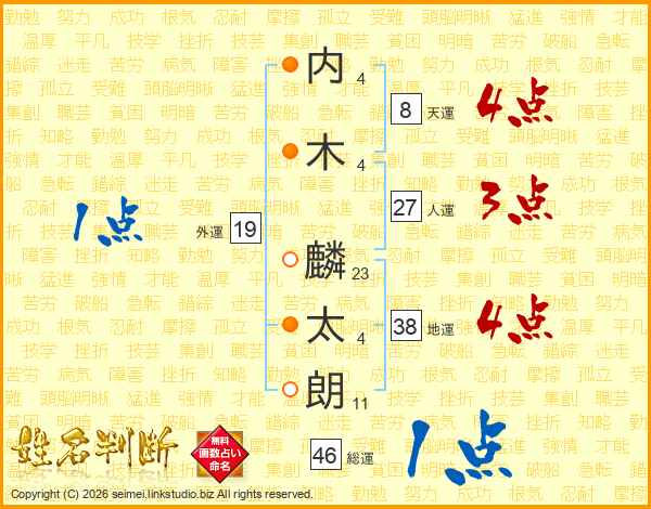 内(4画)木(4画) 麟(23画)太(4画)朗(11画)