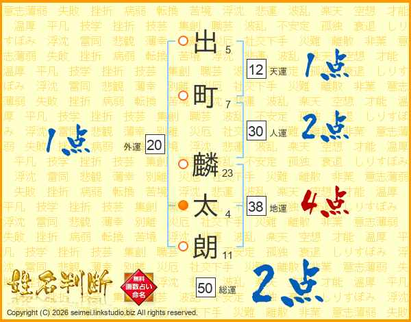 出(5画)町(7画) 麟(23画)太(4画)朗(11画)