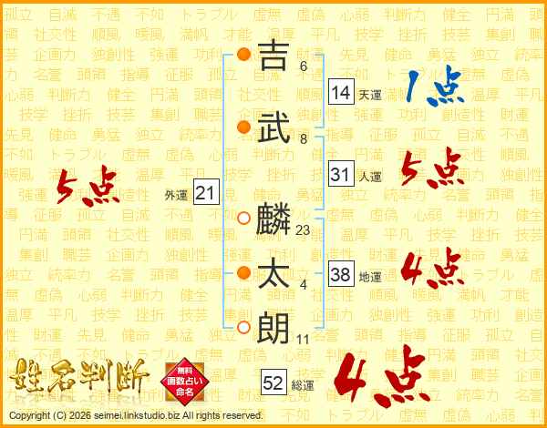 吉(6画)武(8画) 麟(23画)太(4画)朗(11画)