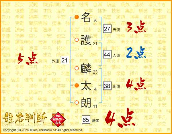 名(6画)護(21画) 麟(23画)太(4画)朗(11画)