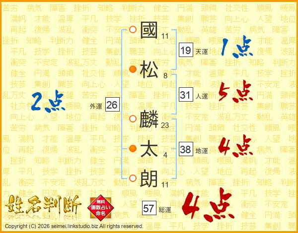 國(11画)松(8画) 麟(23画)太(4画)朗(11画)