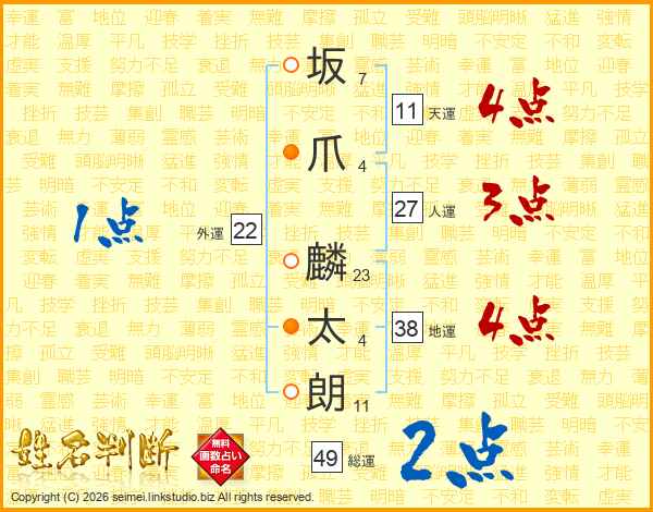 坂(7画)爪(4画) 麟(23画)太(4画)朗(11画)