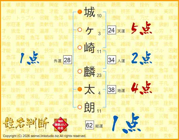 城(10画)ヶ(3画)崎(11画) 麟(23画)太(4画)朗(11画)