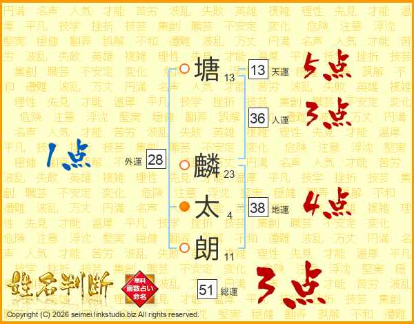 塘(13画) 麟(23画)太(4画)朗(11画)