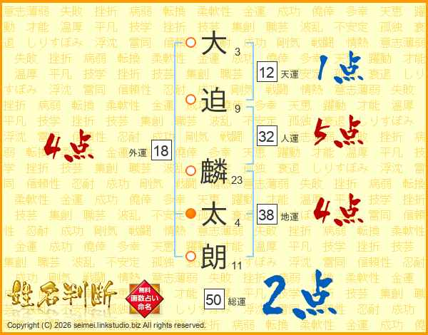 大(3画)迫(9画) 麟(23画)太(4画)朗(11画)