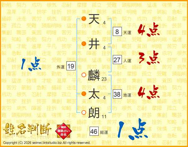 天(4画)井(4画) 麟(23画)太(4画)朗(11画)
