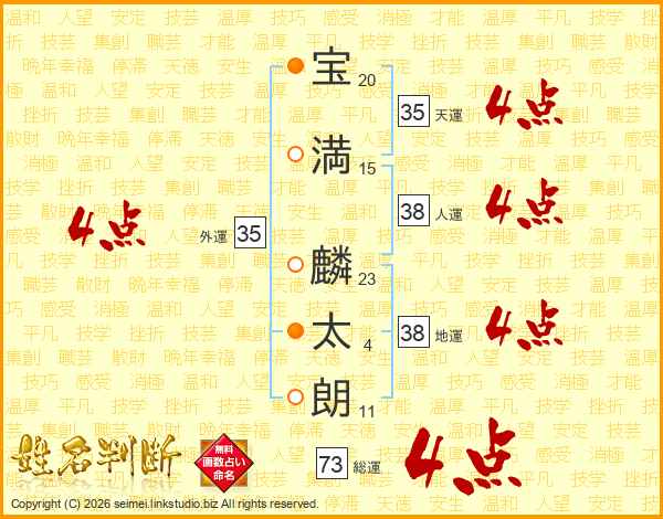 宝(20画)満(15画) 麟(23画)太(4画)朗(11画)