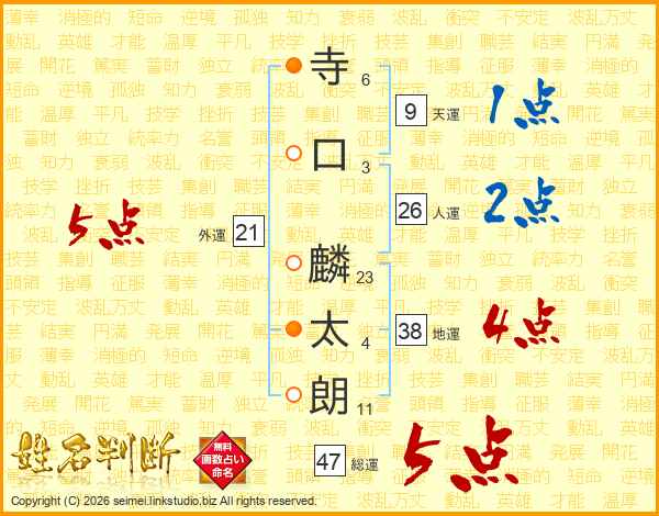 寺(6画)口(3画) 麟(23画)太(4画)朗(11画)