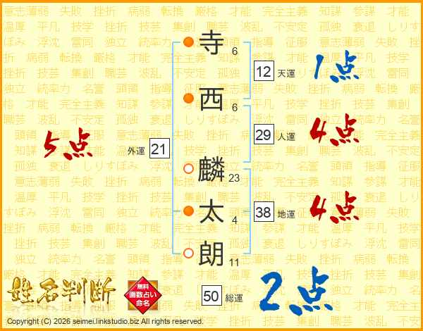 寺(6画)西(6画) 麟(23画)太(4画)朗(11画)