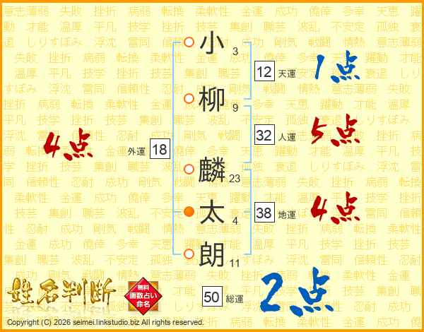 小(3画)柳(9画) 麟(23画)太(4画)朗(11画)