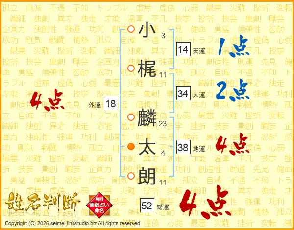 小(3画)梶(11画) 麟(23画)太(4画)朗(11画)