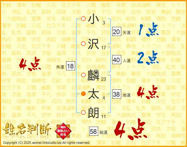 小(3画)沢(17画) 麟(23画)太(4画)朗(11画)
