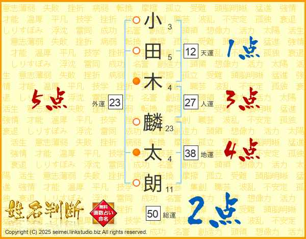 小(3画)田(5画)木(4画) 麟(23画)太(4画)朗(11画)