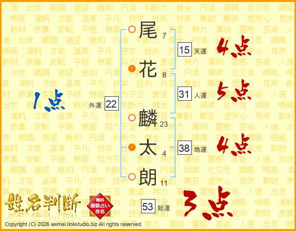 尾(7画)花(8画) 麟(23画)太(4画)朗(11画)