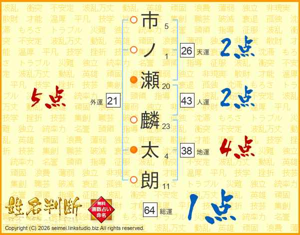 市(5画)ノ(1画)瀬(20画) 麟(23画)太(4画)朗(11画)