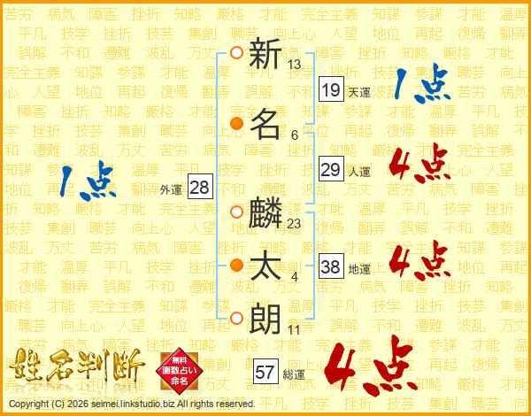 新(13画)名(6画) 麟(23画)太(4画)朗(11画)
