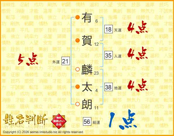 有賀麟太朗さんの総運は56画の1点!